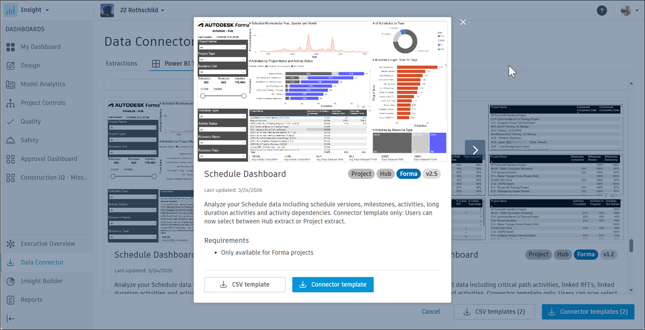 The Schedule Dashboard described in this topic allows you to analyze your Schedule data including schedule versions, milestones, activities, long duration acitivities, and activity dependencies for Autodesk Forma.