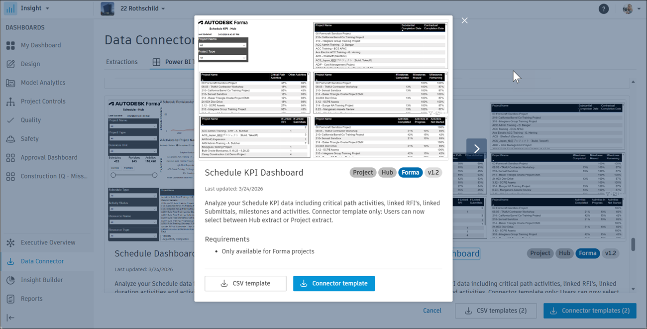 The Schedule KPI Dashboard described in this topic allows you to analzye your Schedule KPI data including critical path activities, linked RFIs, linked Submittals, milestones, and activities for Autodesk Forma.