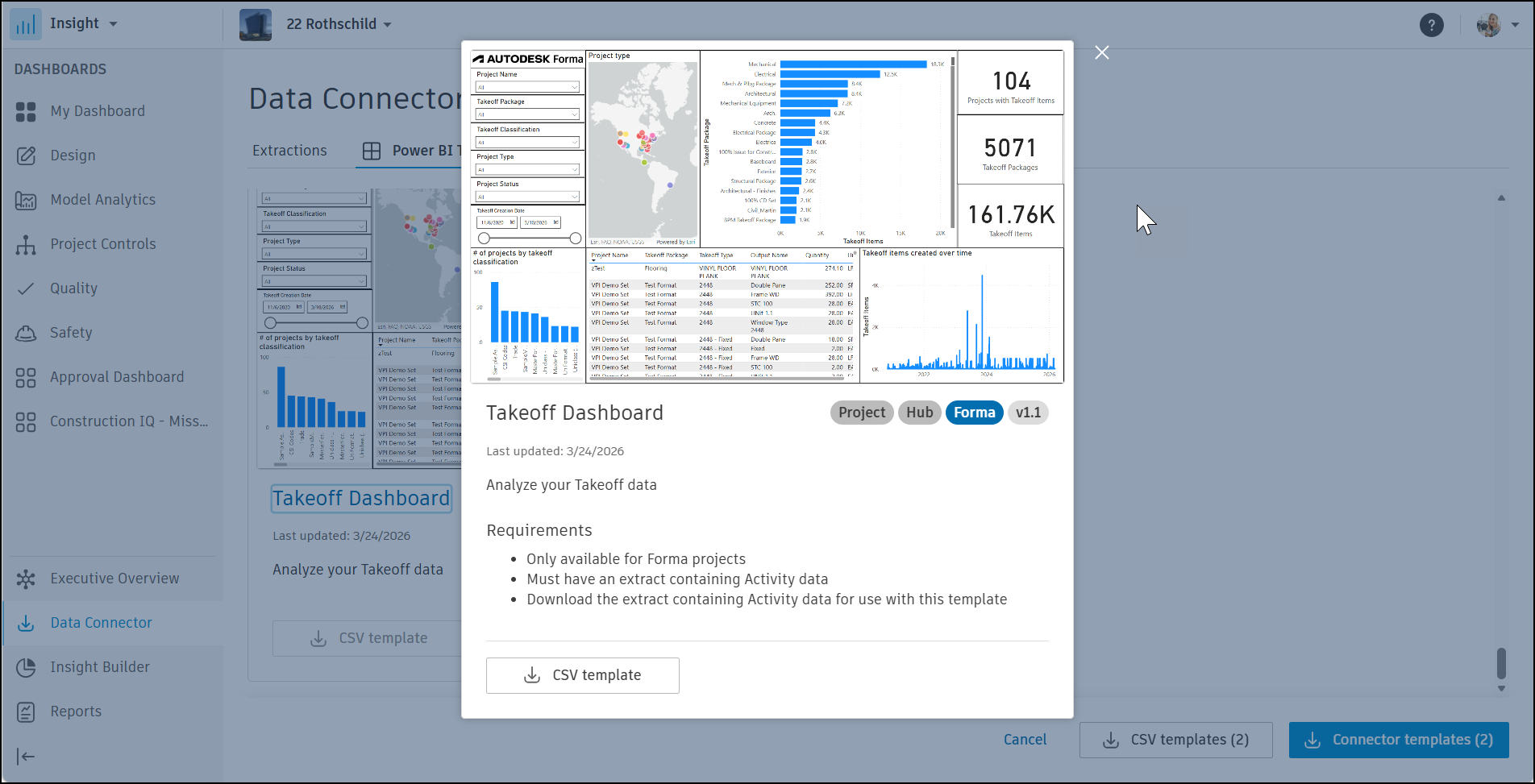 The Takeoff Dashboard described in this topic helps you visualize and analyze your Takeoff data for Autodesk Forma.