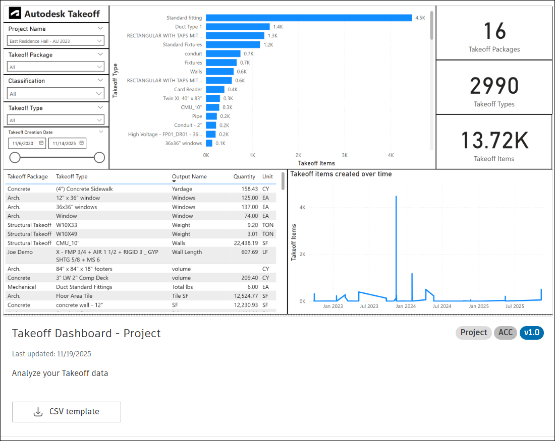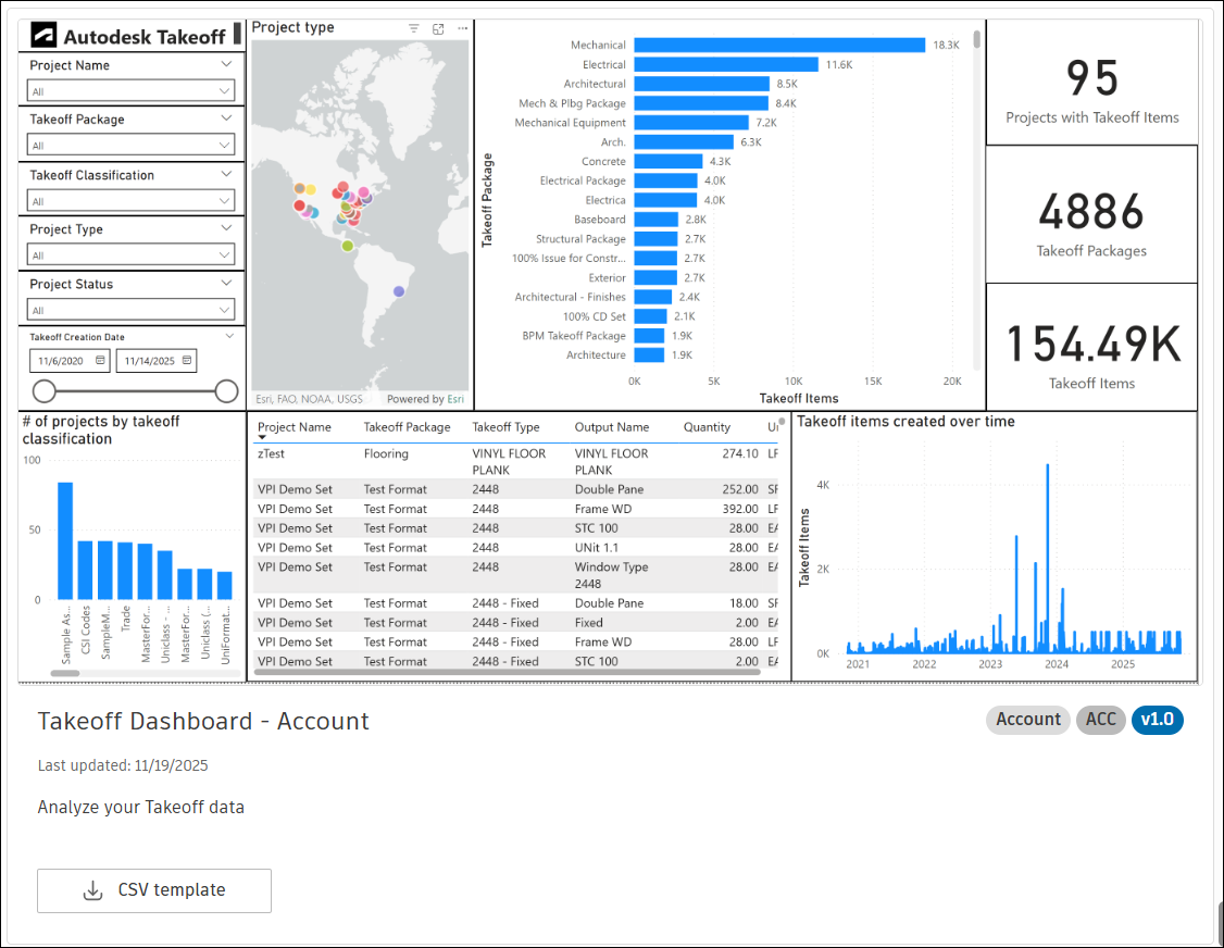 The Takeoff Dashboard - Account and Takeoff Dashboard - Project templates described in this topic help you visualize and analyze your takeoff data. These templates connect to your Insight data extracts and provide pre-built dashboards with key metrics and insights.