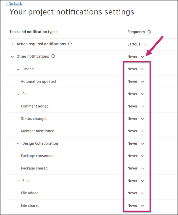To turn off notifications for specific tools and notification types, use the Action required notifications or Other notifications expand icons to select tools and notification types for which you want to set frequency, and then set the frequency to Never.