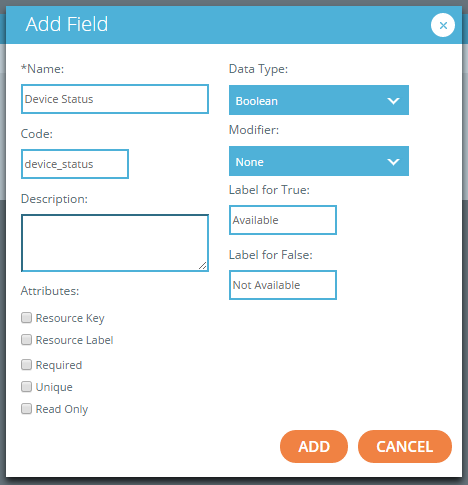 For example, a field titled "Availability" could have the label "Available" for the true state and "Not Available" for the false state. Such fields appear on embedded editors or filters as a single checkbox with the label of the true state, under the title of the field, but they appear on reports as simply the label of their current states.