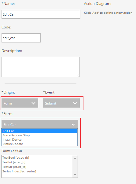 The system executes a routine with this origin event when a certain form is submitted by any user. When building a routine, the user can select the desired form from among all those defined for the current account. All routines with this type of origin event have at least one context variable, identified by the code of the selected form; this variable stores all the values submitted using the form. In the example shown in the screenshot below, the "Edit Car" form has the code "ec", so the "ec" context variable stores the values entered into each of its fields.