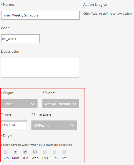 The Fusion Connect platform can also run routines on a timer. The "Weekly Schedule" option allows the user to select a time of day, time zone, and any of the days of the week; the system will execute the routine on that time on each of the selected days every week. Routines using this type of origin event have no context variables.