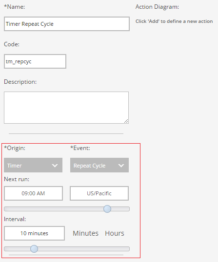 The system repeats the following cycle: wait a predefined amount of time, then execute the routine. The user can define as an interval any whole number of minutes or hours, with a minimum of 1 minute and a maximum of 24 hours. The user can specify a certain time within the next interval length to execute the routine; in the below example, if the current time is 8:52 AM and the user selects an interval of 10 minutes, he or she can select any minute up to 9:02 AM at which the system will execute the routine. The timer then resets to the full interval length at that point, so the system will run the routine at 9:00, 9:10, 9:20, and so on. As with the Timer - Weekly Schedule origin event type, routines using this trigger have no context variables.