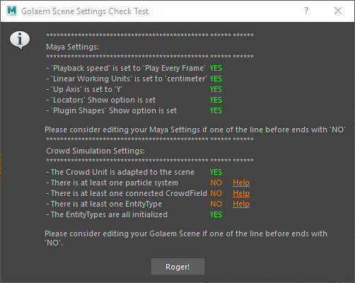 To work properly, Golaem Crowd requires some specific Maya settings (time unit, distance unit…). To check your Maya configuration, run the Golaem Crowd Check Scene Tool using menu Golaem > Check Scene Settings.