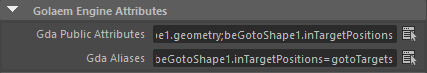 Gda Public Attributes | This attribute stores the list of GDA Public Attributes which will be made available for other DCCs running the Golaem Engine when exporting the GDA file. Public GDA Attributes can be overridden in these DCCs. The helper button brings up the GDA Attributes window that lets you choose which GDA attributes to make public. |