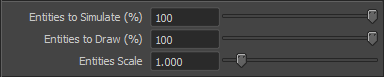 Entities to Simulate (%) | Percentage of simulation particles which will be initialized and animated. This parameter is mainly for debug purpose, but can prove useful by saving performance for testing computation intensive scenes (physics or heavy navigation behaviors). |