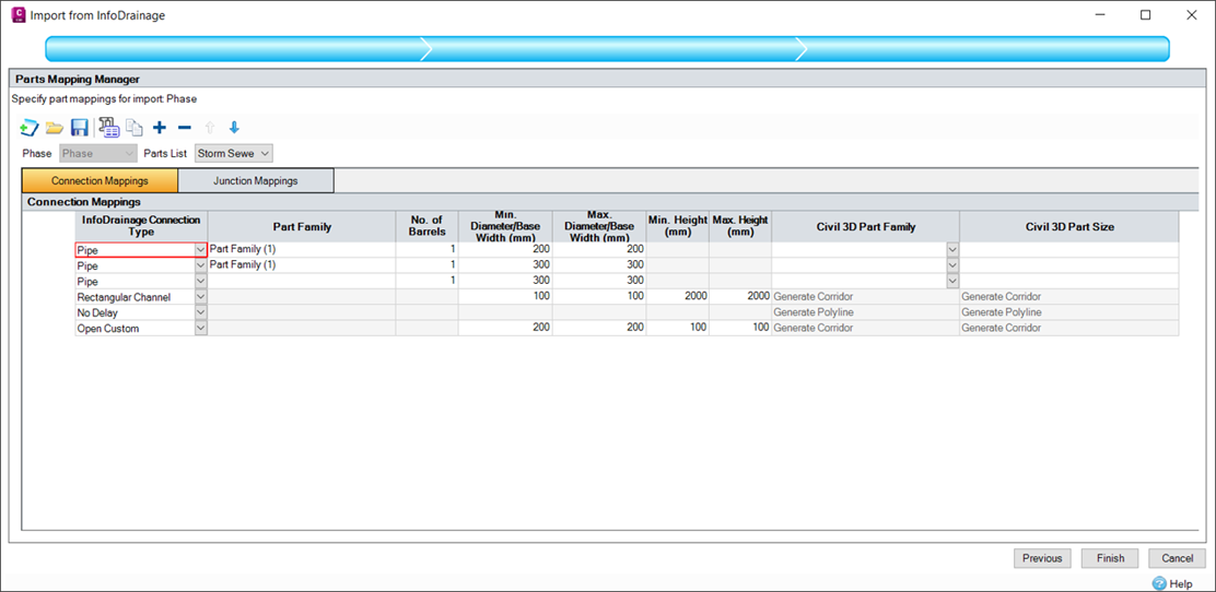 For each selected phase there will be a parts mapping step, which allows the mapping of InfoDrainage types to Civil 3D part types. See Parts Mapping for more details.