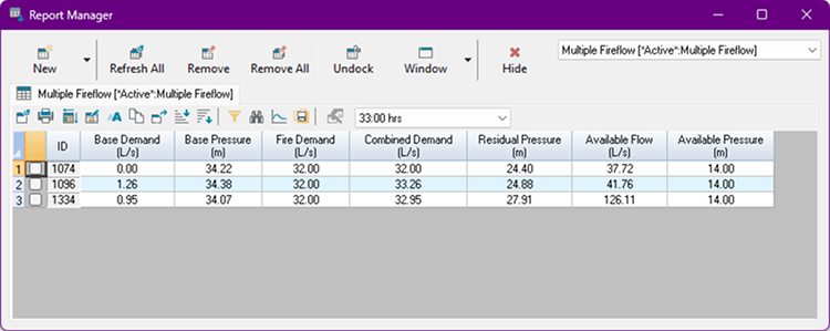 Most results in the Report Manager for Multiple Fireflow Analyses are the same as those for standard simulations. However, unlike regular extended time runs, these simulations assign additional required fire demand values to selected fire junctions during the defined fire event.