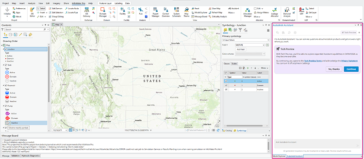 The Autodesk Assistant is now available in InfoWater Pro®. It provides AI-guided self-service and in-product options to find support. Using agentic-AI enhancements, Autodesk Assistant helps you get results faster while keeping your data and IP secure and compliant with enterprise governance. Its goal is to remove friction, simplify common tasks, and help you make faster, more informed decisions.