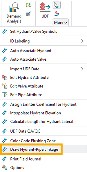 This tool draws a link (line) between the hydrant and the associated pipe. These links are used to create a shapefile of hydrant laterals. The laterals may be displayed or hidden at any time from the ArcMap Table of Contents. These lines is for visualization only and does not impact a UDF simulation.