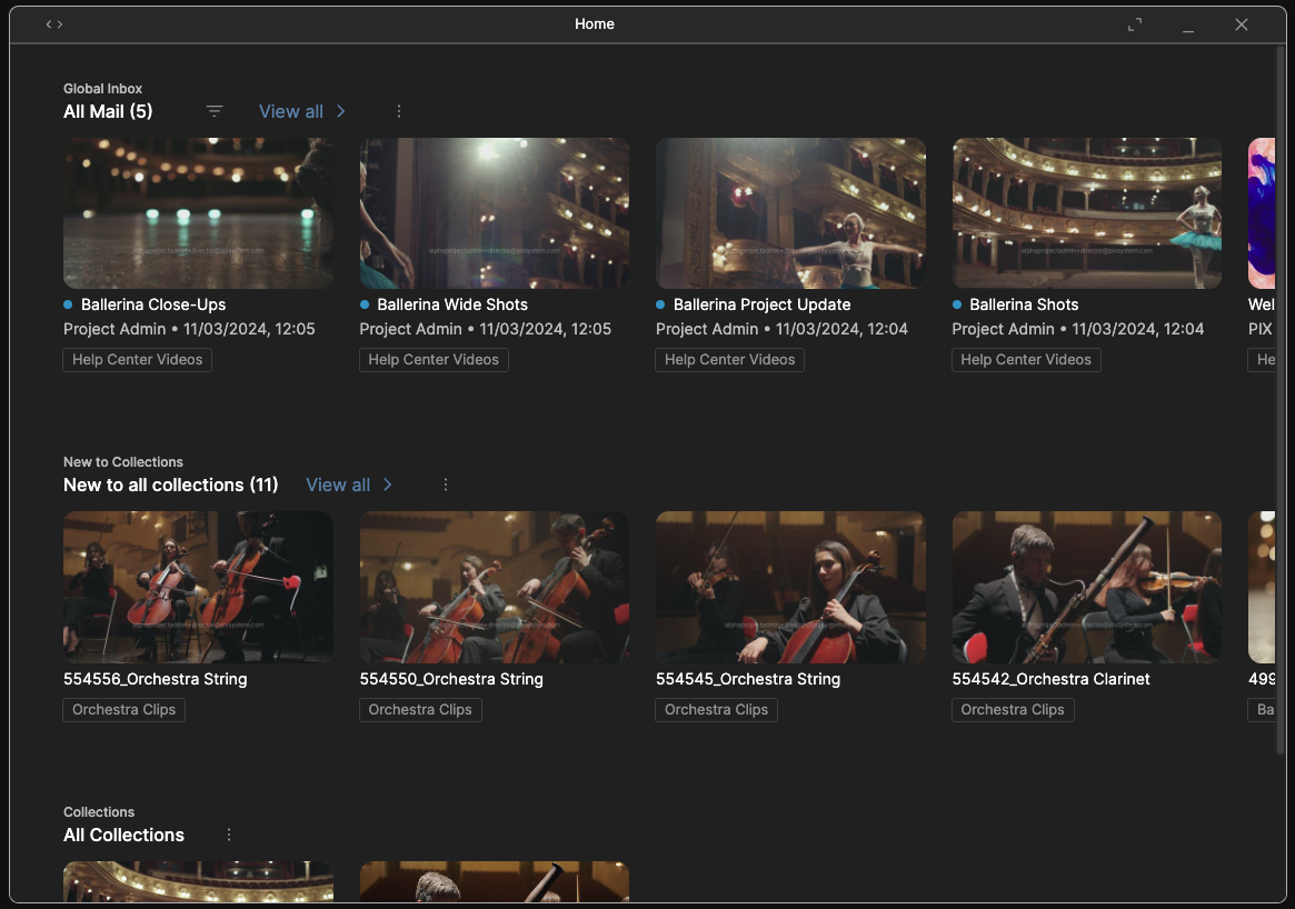 Welcome to the new PIX experience and the brand new Home panel. Presented to you when you first start your journey in new PIX and always accesible from the panel launchers on the left side of your screen, this area presents a consolidated view of all activity for your work and Projects listed based on recent activity or organized by Collections.