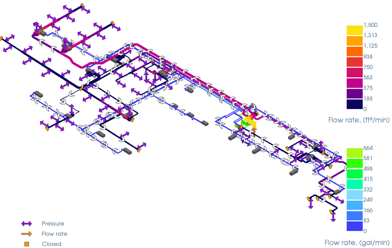 Flow rate results and flow direction arrows for ducting and piping networks