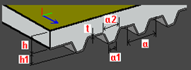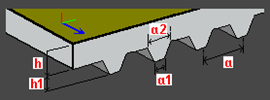 Trapezoidal plate: h - plate height t - plate thickness a, a1, a2 - dimensions of a single plate segment (spacing, width values) |