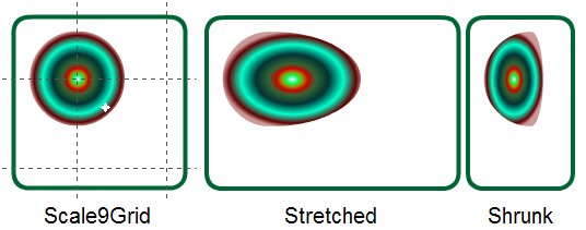 Shapes with bitmap and gradient fill styles are displayed identically in Flash and Scaleform. Note that both gradient and bitmap fills fail to preserve the Scale9Grid transformation. In effect, the transformation is only applied to the vector shape outline, but not to the fill style content. For example: