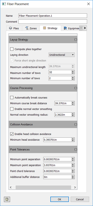 The Strategy tab determines how the plies are computed, the direction of the layup, and specific tow parameters on the paths. Edit values as needed to work with your equipment.