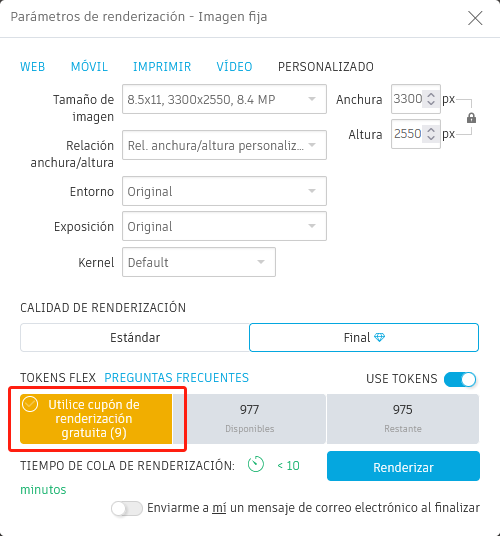 Si hay cupones de renderización disponibles, se pueden utilizar en lugar de tokens de Flex o créditos de nube. Utilice estos cupones al enviar una renderización desde Fusion o Revit, o al realizar de nuevo una renderización desde la página Mis renderizaciones. Se pueden utilizar para renderizar cualquier tipo de trabajo con diferentes resoluciones.