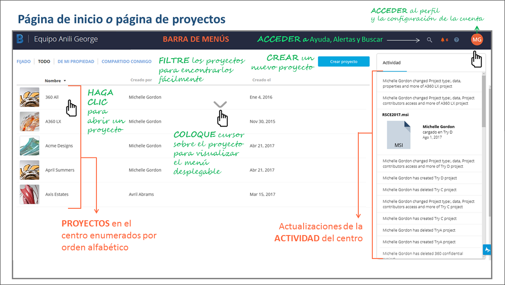 Al iniciar sesión en A360, se abre la página de inicio del centro o la página de proyectos. A continuación se muestra el diseño de la página de proyectos para ayudarle a desplazarse por ella. En la página de proyectos, puede: