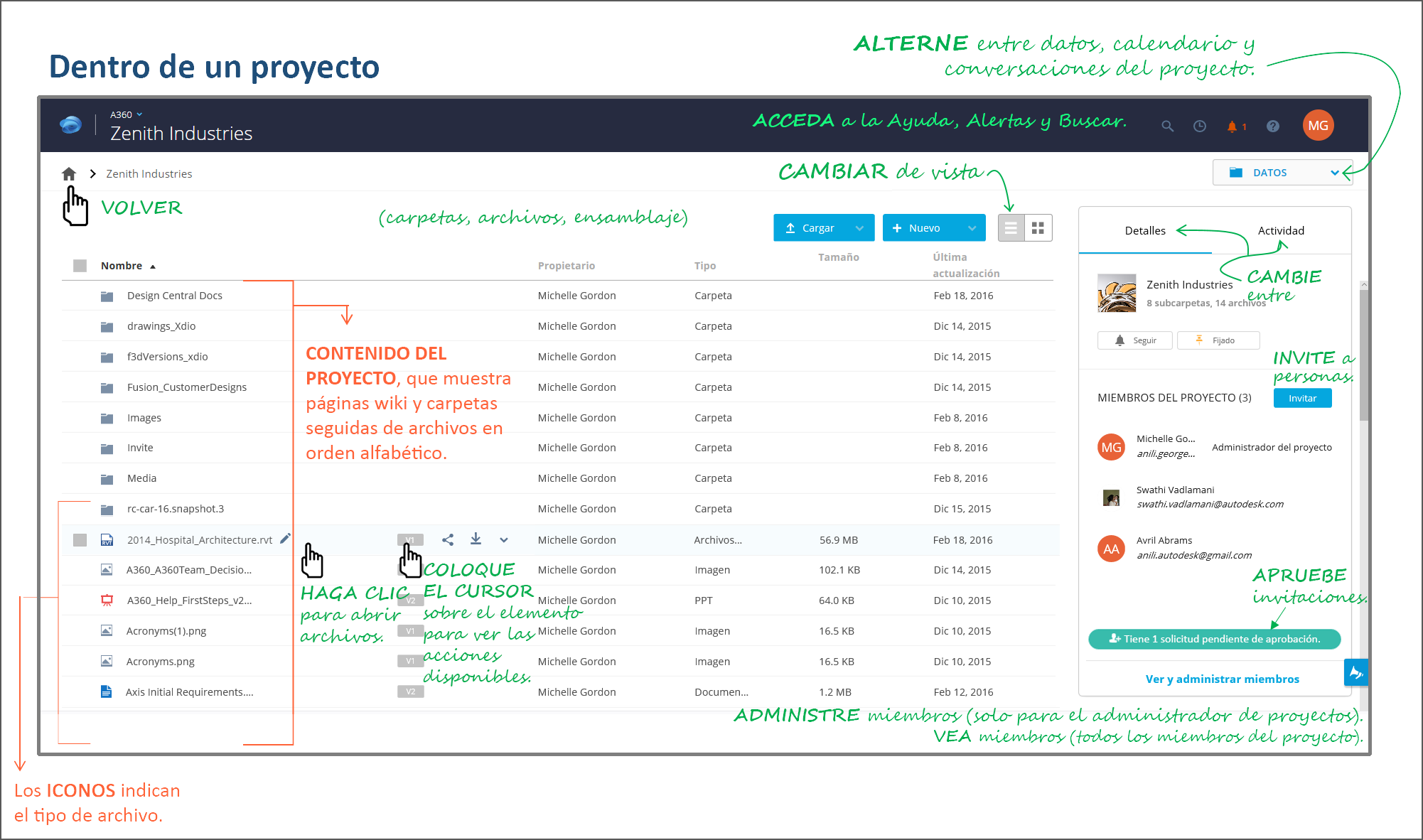 En la ilustración que aparece a continuación, se muestran un diseño de un proyecto, las acciones que se pueden realizar en la página y cómo desplazarse por ella. El texto en color naranja muestra cómo se organizan los espacios de la página y el texto en color verde destaca las acciones que se pueden realizar en la página.