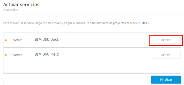 Importante: Después de crear un perfil del proyecto, puede activar los servicios de BIM 360. Tenga en cuenta que debe activar primero Document Management antes de poder activar los