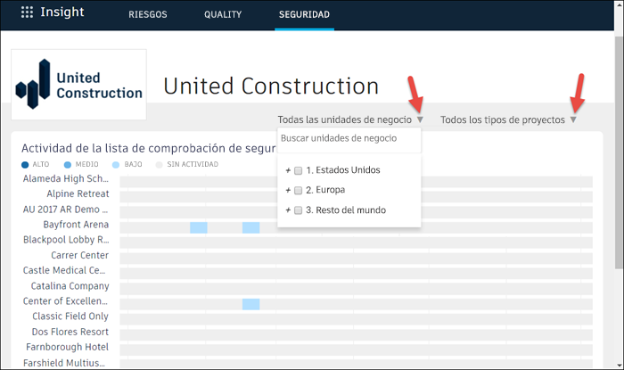 - Actividad de la lista de comprobación de calidad: muestra el nivel de actividad de la lista de comprobación de calidad de cada proyecto.