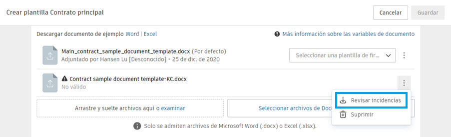 Durante el proceso de creación de plantillas de documento, es posible que desee descargar y editar una plantilla de documento de ejemplo. Para ello, seleccione Word o Excel para descargar un archivo de Word o Excel personalizable.