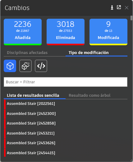 Seleccione una opción entre Añadido, Eliminado o Modificado para visualizar esos resultados en las versiones del modelo.