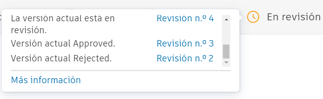 Coloque el cursor sobre el estado En revisión para mostrar los vínculos de revisión pertinentes y el estado de revisión.