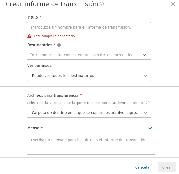 Una vez que haya seleccionado los archivos que desea transmitir y haga clic en el botón Transmitir, debe completar el formulario Crear informe de transmisión.
