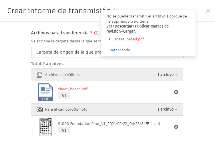 Al cambiar entre la opción de carpeta de destino o de origen, es posible que no tenga el permiso de carpeta correspondiente o que los archivos se supriman. Estos nombres de archivo pasarán a estar en color rojo y se agruparán en Archivos no válidos.