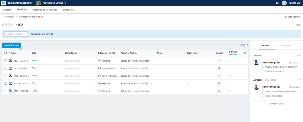 Al abrir una revisión cerrada, el botón Transmitir todo se muestra por defecto. Haga clic en Transmitir todo para seleccionar todos los archivos de la revisión para su transmisión.
