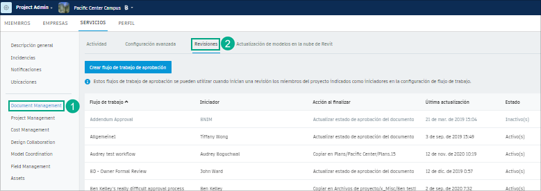Seleccione Document Management en el panel de la izquierda y haga clic en la ficha Revisiones para visualizar los flujos de trabajo de aprobación existentes.
