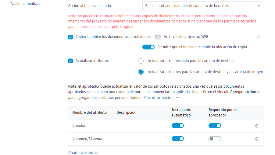 Sección Acción al finalizar: especifique si desea copiar los documentos en otra carpeta. Seleccione esta opción para actualizar los atributos y los proyectos creados después del 23 de marzo de 2021, añadir atributos y solicitar al aprobador que introduzca valores de atributo antes de enviar la revisión.