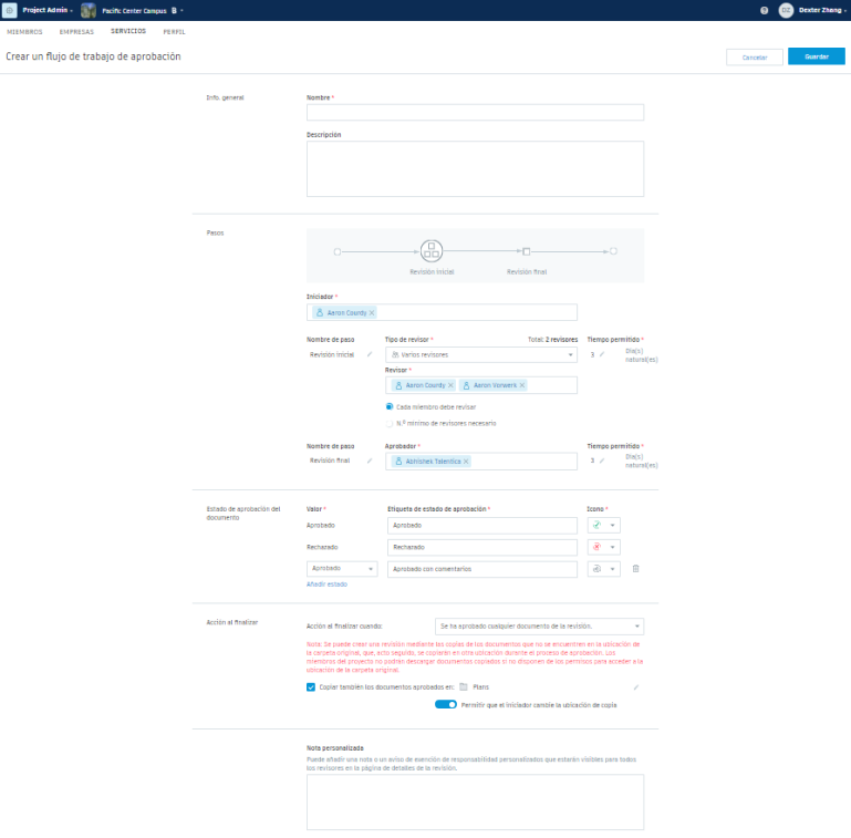 Utilice flujos de trabajo de aprobación para iniciar la revisión y la aprobación de los documentos del proyecto.