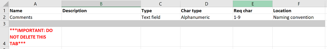 En el siguiente ejemplo, se ha creado una nueva ficha de campo de texto. Los atributos se denominan Comentarios en la celda A2. El tipo de carácter es alfanumérico en la celda D2, con un valor de longitud de caracteres requerido de 1 a 9 caracteres (inclusive) en la celda E2. Este atributo se mostrará en la convención de nomenclatura seleccionada en la celda F2.