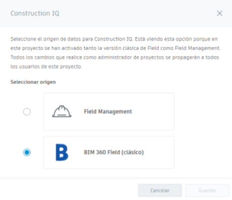 Si el proyecto tiene activadas las opciones Classic Field y Field Management, puede activar y desactivar los orígenes de datos de Construction IQ que se muestran en las tarjetas.