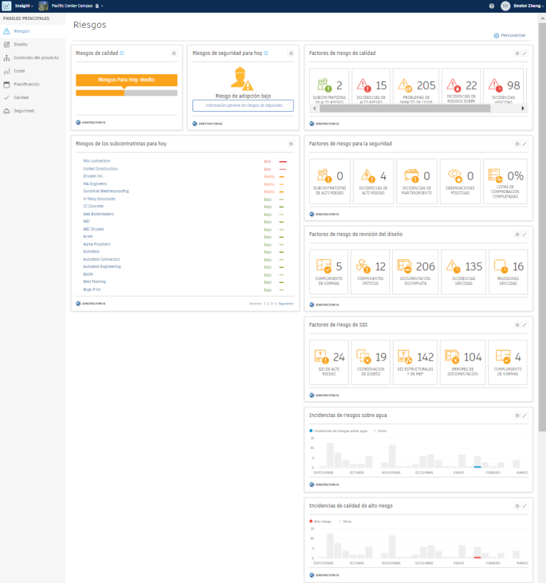 El trabajo en un proyecto de construcción puede requerir la participación de cientos de subcontratistas e incluir cientos de incidencias y un entorno diario en constante cambio. Insight es un ecosistema que puede proporcionar análisis, información predictiva y datos unificados en el nivel de proyecto. Puede ayudarle a estar al tanto de lo que está sucediendo en un proyecto, evaluar tendencias y patrones en los datos del proyecto, identificar desequilibrios y problemas, y usar datos de riesgos predictivos para mejorar la eficacia del proyecto.