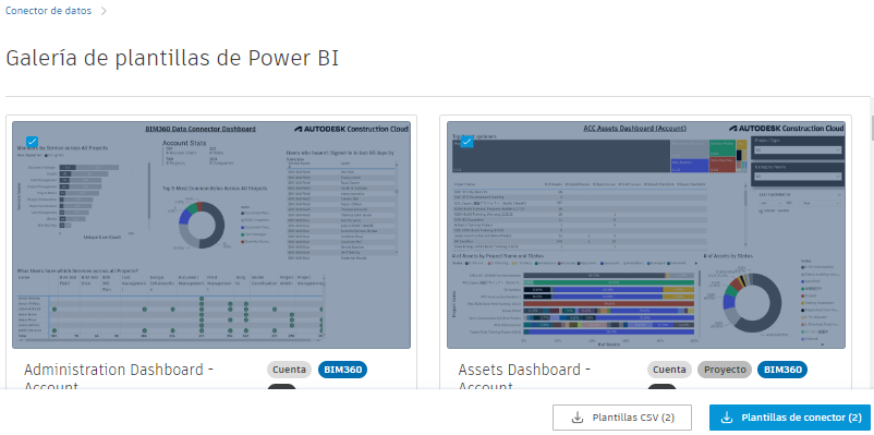 Los administradores de proyectos y los miembros con acceso de descripción general de ejecutivos pueden examinar y descargar plantillas de Power BI desde la galería de plantillas disponible en el conector de datos.