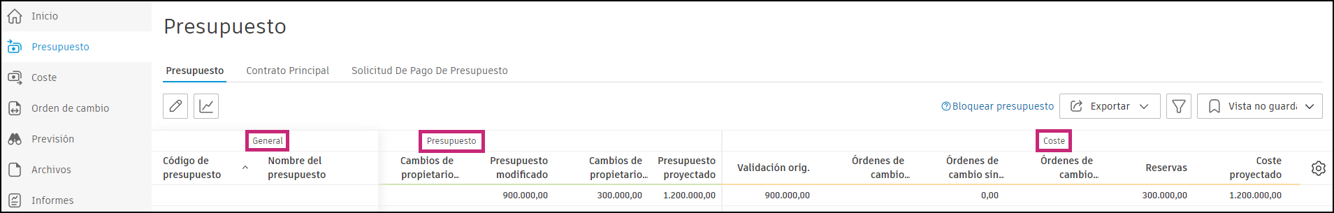 - Tabla de presupuestos: organiza el presupuesto entrante, los costes salientes y los cambios en función de la estructura de codificación de presupuesto preferida.