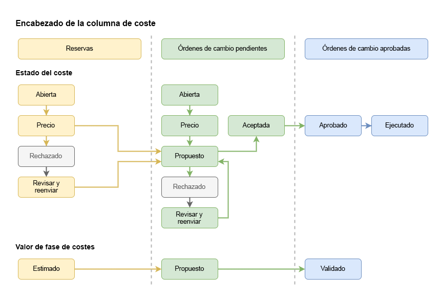 En la siguiente imagen, los colores representan la columna en la que aparecen los valores en función del estado del coste. El valor introducido proviene de la fase de coste del elemento de coste.