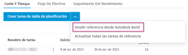 En la primera ficha Coste y tiempo, seleccione la flecha situada junto al botón Crear tarea de planificación y, a continuación, seleccione Añadir referencia de Autodesk Build.