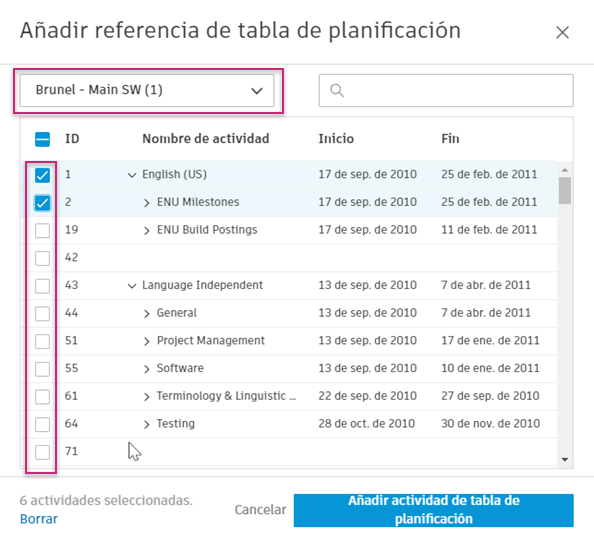 Este conjunto de funciones permite a los equipos añadir hitos clave de planificación y asociarles partidas presupuestarias para planificar visualmente sus presupuestos en una vista Gantt. Existen dos métodos para añadir hitos de planificación: