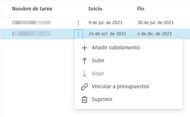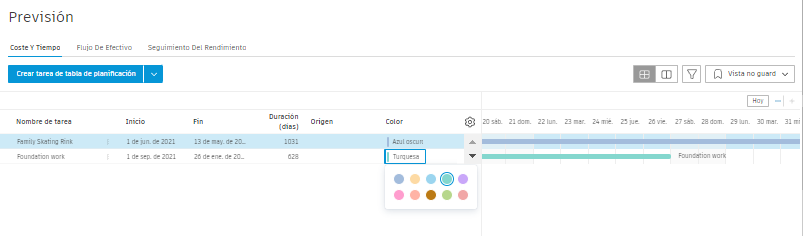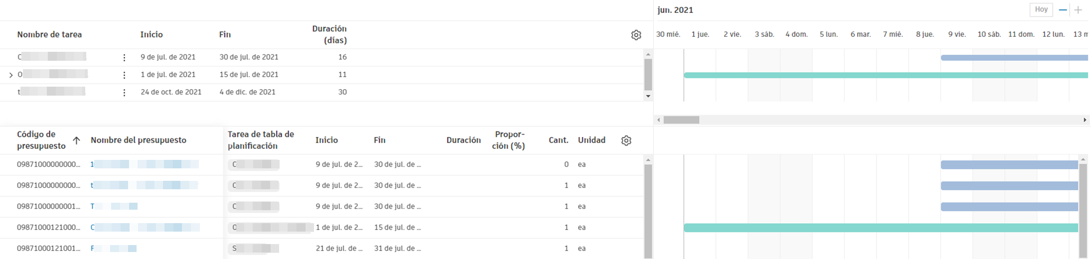 Si las fechas son las mismas para presupuestos y tareas vinculados, los cambios realizados en las fechas de las tareas de tablas de planificación actualizarán automáticamente las fechas correspondientes de los elementos de presupuesto.
