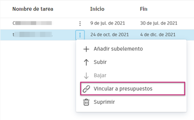 Para vincular una tarea de planificación a un elemento de presupuesto:
