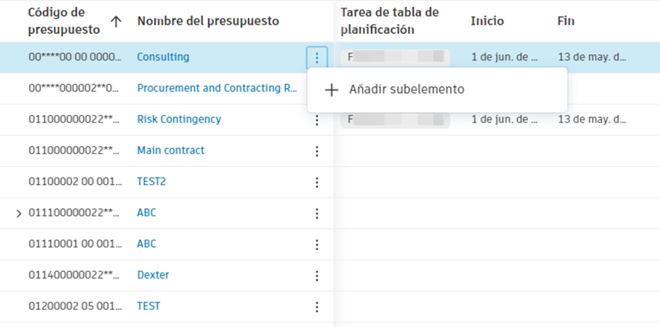 Sin embargo, si las fechas del presupuesto se modifican manualmente o difieren de las fechas de las tareas de tablas de planificación, las fechas de los elementos del presupuesto no se actualizarán automáticamente.