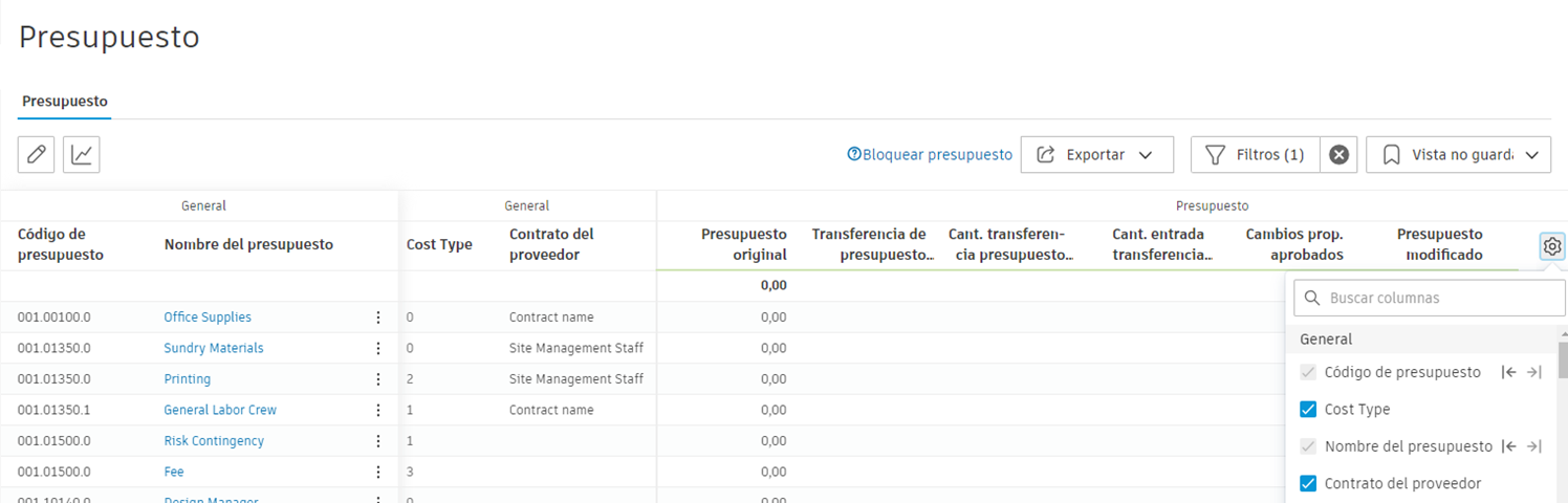 En la vista detallada de la SOV de contrato, el modo Columna también puede mostrar las columnas relacionadas con el presupuesto original si no se ha seleccionado Un presupuesto para varios contratos.