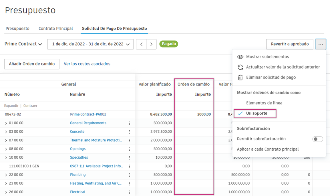 En el caso de solicitud de pago de presupuesto y contrato principal, el modo Columna muestra las órdenes de cambio aprobadas.