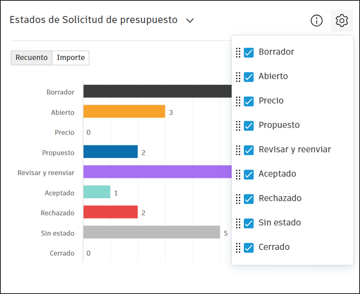 Vistas de recuento y cantidad: alterne entre la visualización del recuento y la cantidad asociada a cada estado.