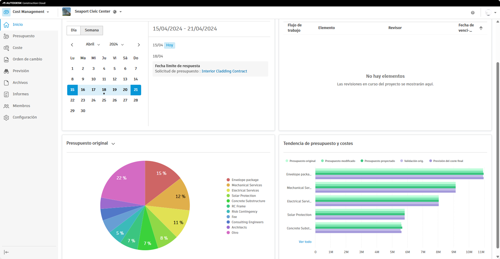 La página de inicio de Cost Management proporciona una descripción general rápida del estado financiero del proyecto. Los datos se recopilan y calculan automáticamente y se muestran en gráficos con métricas como el tiempo y el coste.